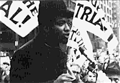 THEN: "Growing up in America means you gotta support the war in VietNam and you have to be a responsible citizen. We don't want to be responsible citizens, we're irrational, we're irrational and crazy. And that's what this whole trial is about. America destroys our dreams. And we're fighting to recover our dreams!"