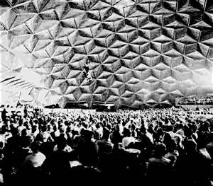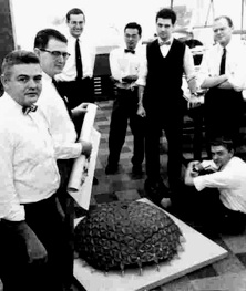 Upon graduation in the late 50's from the Institute of Design, Illinois Institute of Technology, MM was employed by Kaiser Aluminum, Chicago, to work under Don Richter, (second from left) on the design team of the Kaiser Aluminum Geodesic Dome. On the team was Bill Tokeshi (4th on the right) who programmed the structural and panel dimensions for a line of domes of varying diameters from 145 feet and up, calculating them on a room-sized Univac, (then advanced technology) eliminating the complex "hand"- dimensioning otherwise required. MM was so taken with spherical geometry that it was almost all he thought about an entire year..
