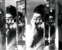 Fascinated by mirrors: in the multi-reflections of mirrored barber shop walls, in Mother’s adjustable folding mirrors (left), in the play of repeating patterns, and ultimately, in tracing reflections or causal chains all the way back to the Source. But primarily, playing with mirrors and multiple variable reflections resulted in the design of the Kaleidoscope Theatre System, Expo 67